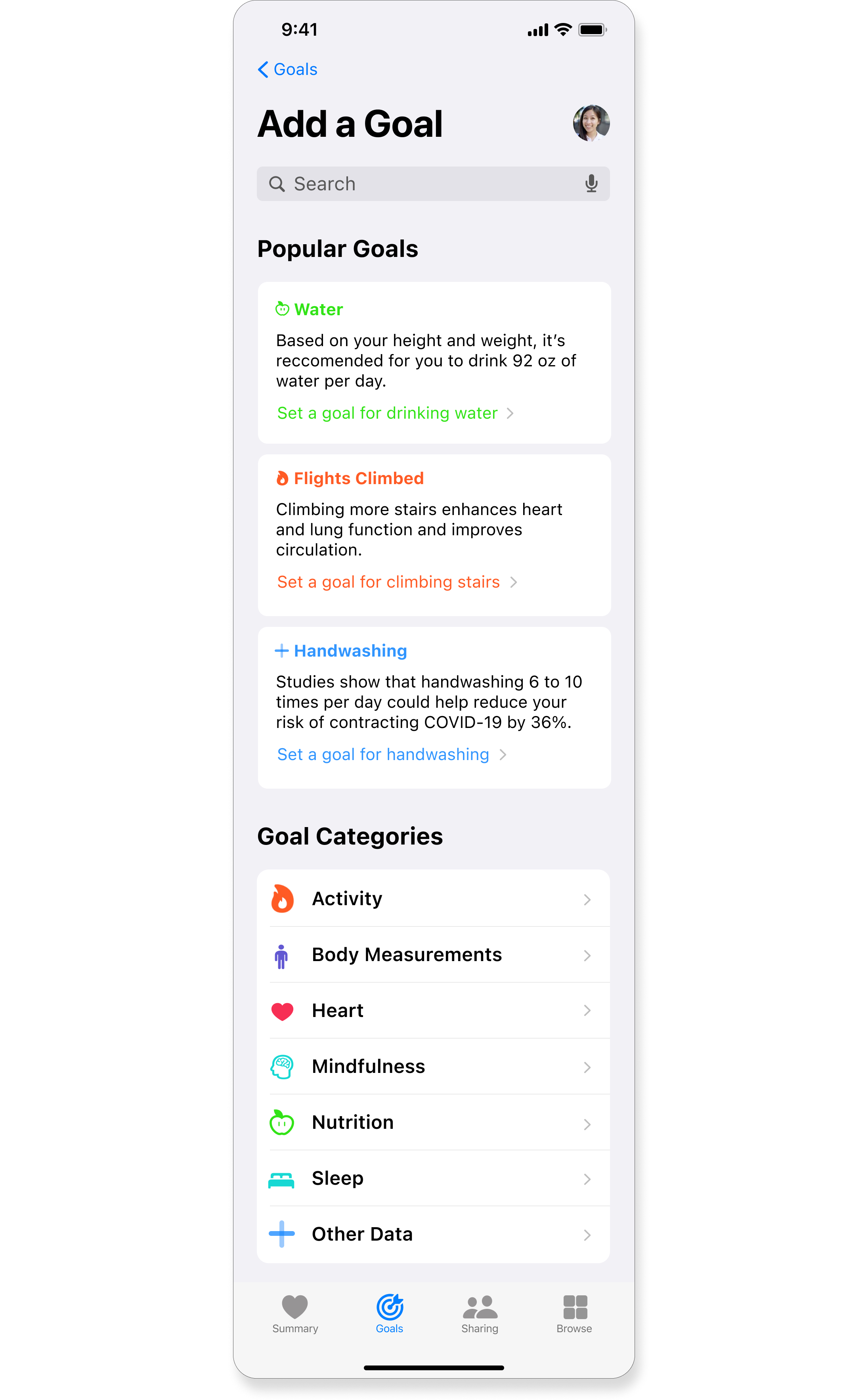 Apple Health provides a way for iPhone users to see an overview of their health data from various sources, from the Apple Watch to integration with a huge number of health-related iOS apps. Users can view progress and trends in their health activities, from water intake to mindful minutes. While users who also use the Apple Watch can set 3 specific goals related to their activity, the app lacks a way to set goals related to most of the many health areas that it tracks. So, my challenge was to add a feature that would allow users to leverage all that existing data to set goals so they can better their health.