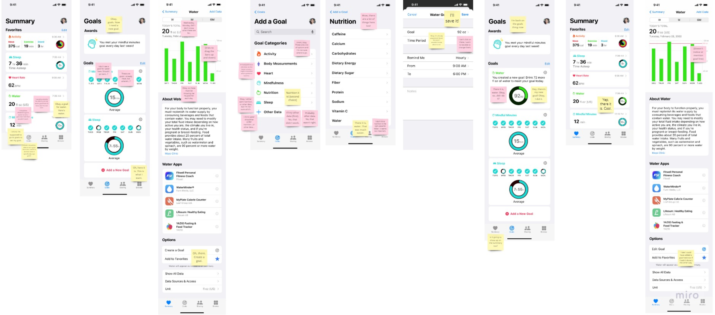 I imagined how Dianne might flow through the app to create a goal within the Apple Health app, so that I had a clear idea of the screens I would need to mock up in order to properly test my ideas. This shows extremely low-fidelity wireframes in the flow to create a goal within the app.